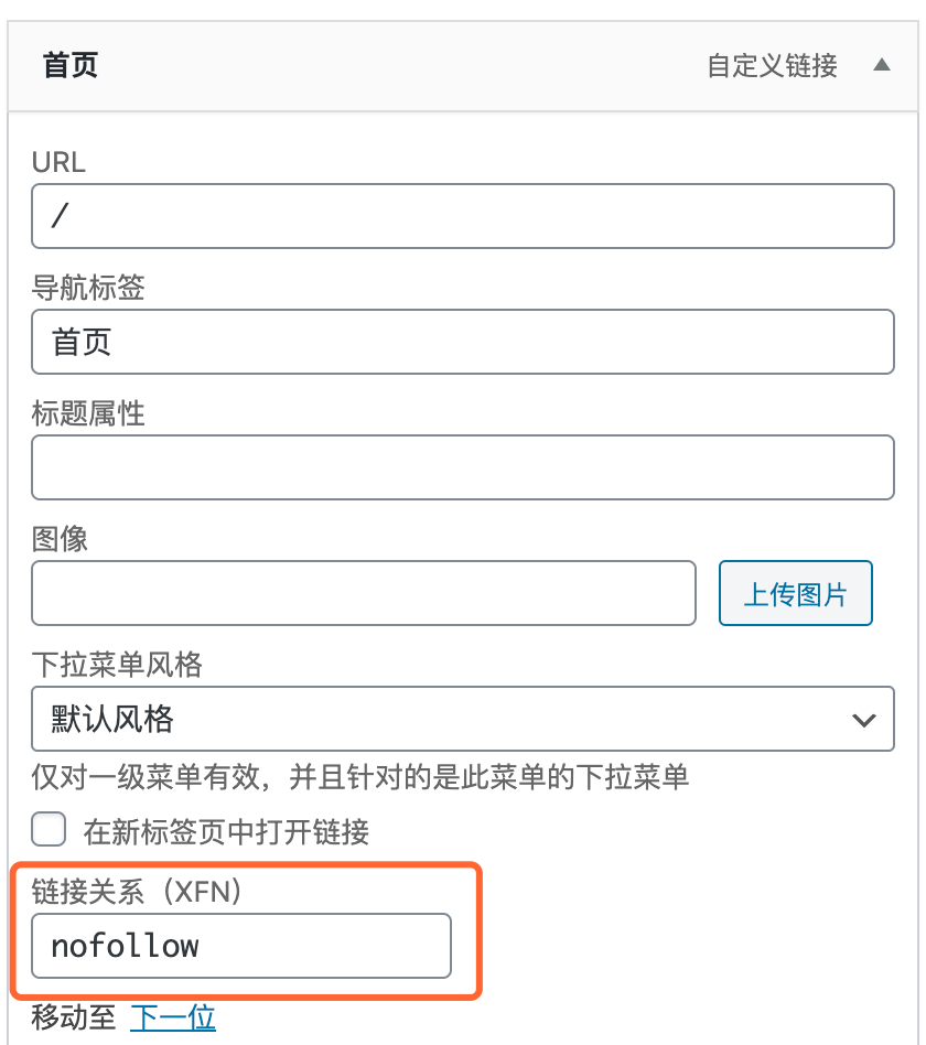 找到需要设置的菜单链接,展开设置选项,找到链接关系(XFN),然后填写nofollow。