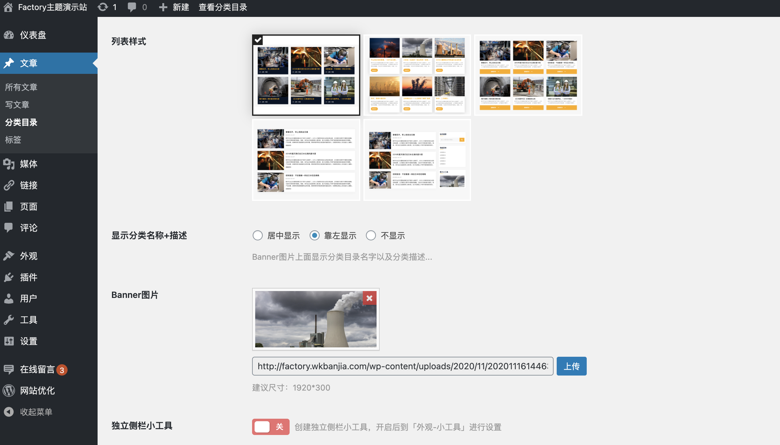主题现阶段有5种列表样式,如果使用带侧栏的列表样式,还支持为每一个分类列表设置独立的小工具。